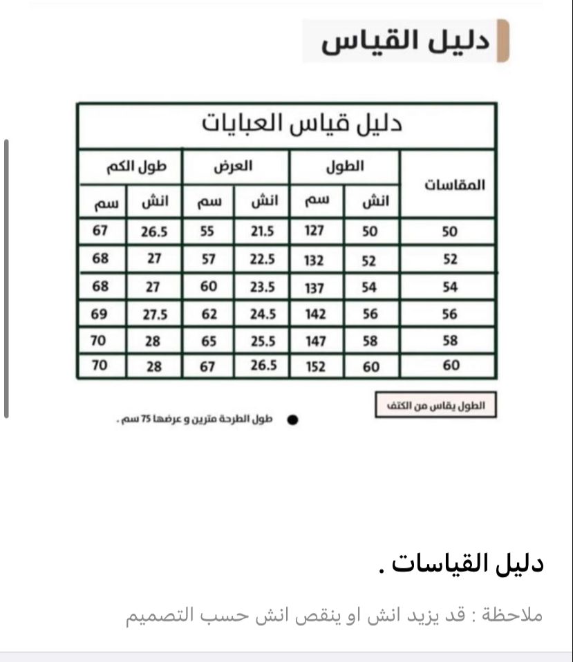- طول العباية يؤخذ من الكتف الى أسفل الكعبين (من الأمام)